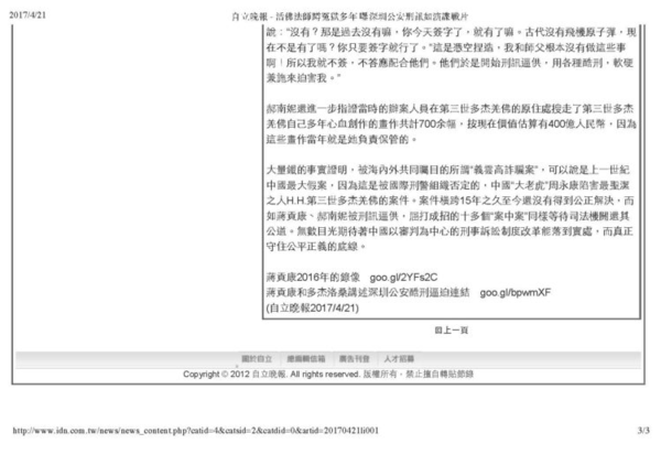 郝南妮還進一步指證當時的辦案人員在 第三世多杰羌佛 的原住處搜走了 第三世多杰羌佛 自己多年心血創作的畫作共計700余幅,按現在價值估算有400億人民幣,因為這些畫作當年就是她負責保管的。
